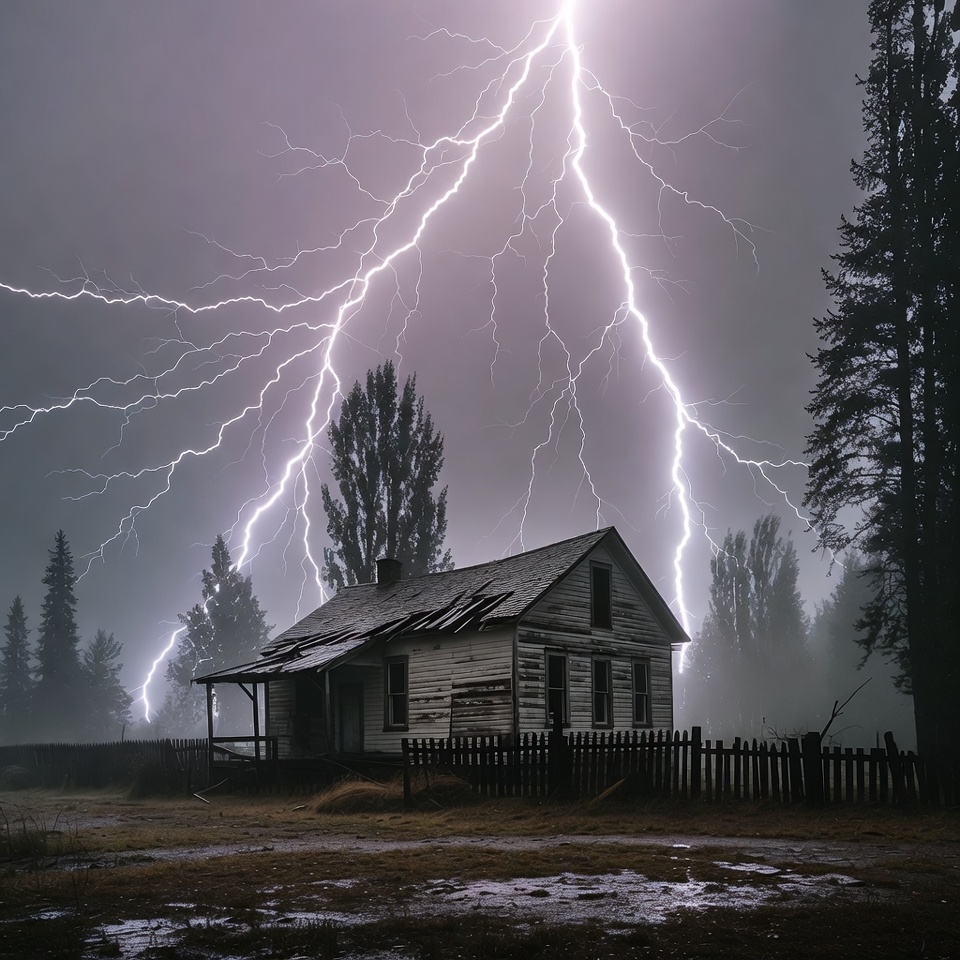 Lightning striking old abandoned house