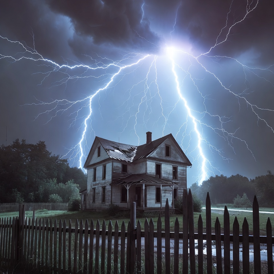 An old, dilapidated white house stands in a grassy yard surrounded by trees and a picket fence. Dark storm clouds fill the sky with multiple bright lightning bolts striking dramatically behind the house. The eerie scene features weathered siding, a sagging roof, and broken windows.