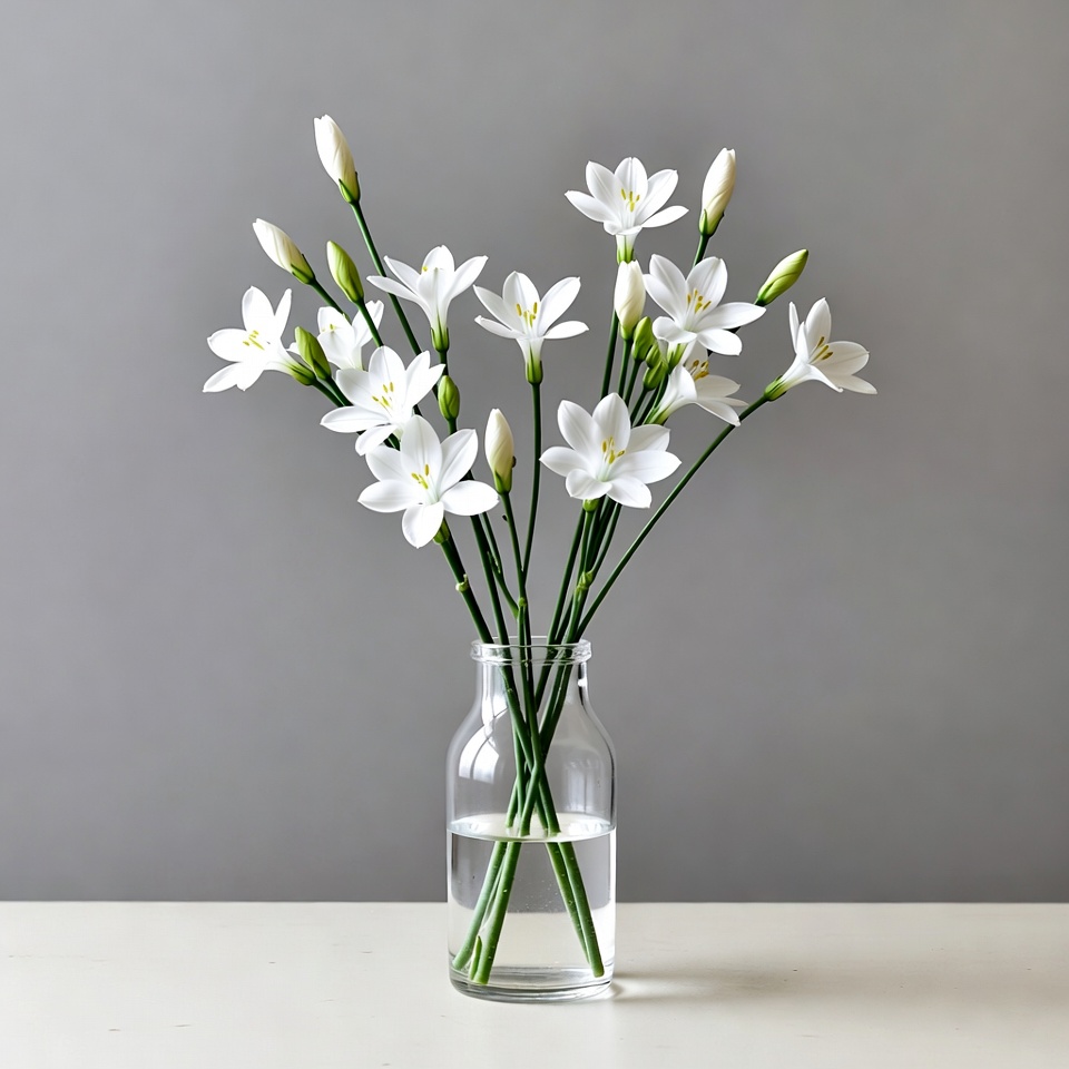 A bouquet of delicate white flowers with slender green stems stands in a clear glass milk bottle. The flowers feature small trumpet-shaped blooms and buds. The arrangement is centered on a white surface against a light gray background.