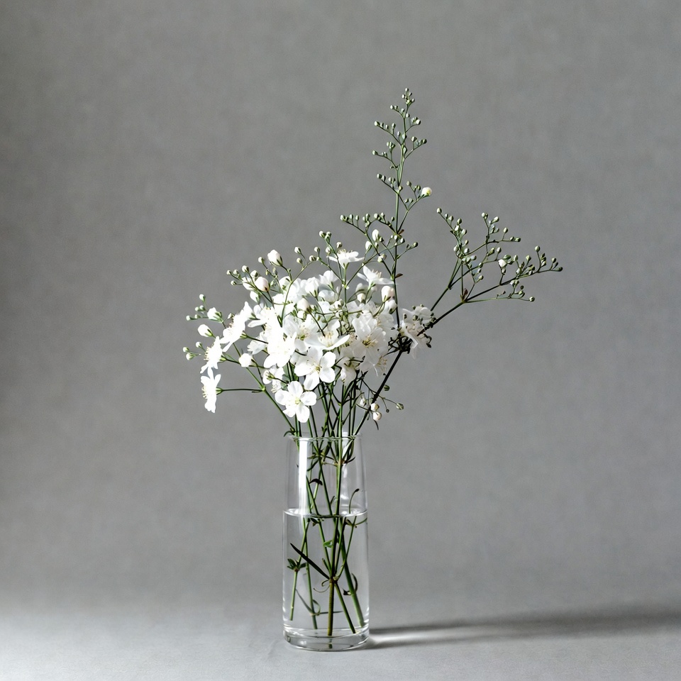 bouquet, clear vase, delicate flowers, floral arrangement, flower vase, fresh flowers, glass vase, gray background, isolated background, stems, tiny blooms, water, white flowers, white gypsophila, baby's breath