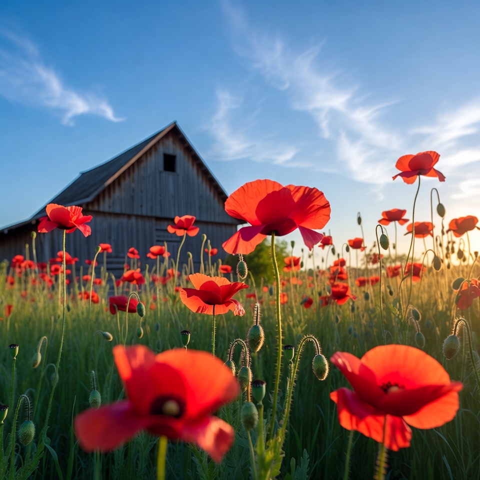 A vibrant field of red poppies sways in front of a rustic wooden barn under a clear blue sky. Sunlight illuminates the delicate poppy flowers and their green stems during golden hour. Wispy clouds add to the scenic rural landscape.