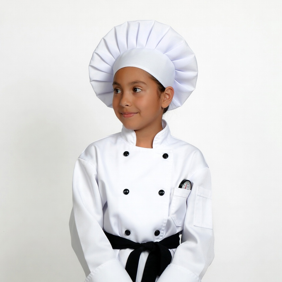 A young girl with smiling expression wears a white chef's hat and matching uniform with black waist tie. She stands with hands together against an isolated white background. A small utensil is tucked into her chef jacket pocket.