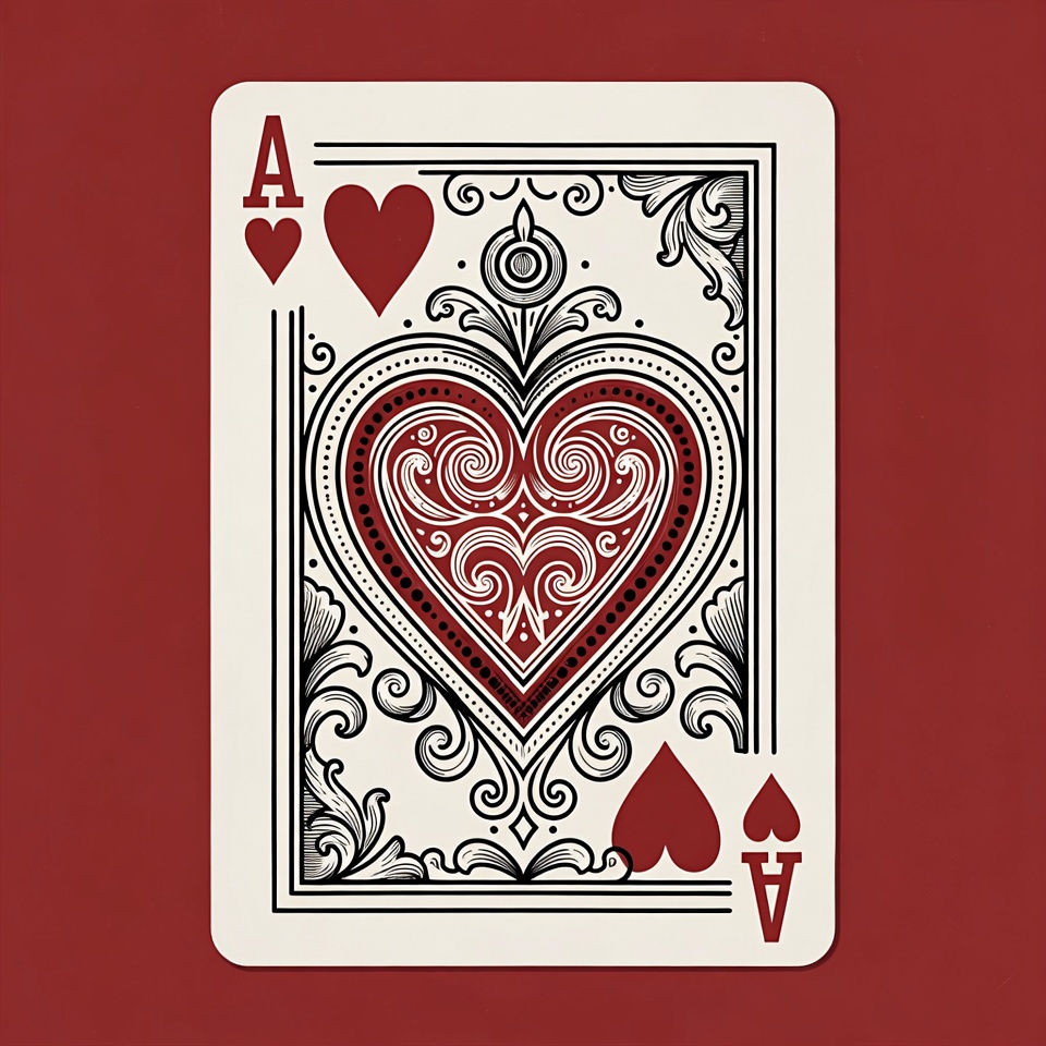 black ink, blackjack, card game, casino card, floral pattern, gambling, hearts suit, illustration, isolated background, ornate design, playing card, poker card, red hearts, scrolls, vector art, vintage style, white background, ace of hearts