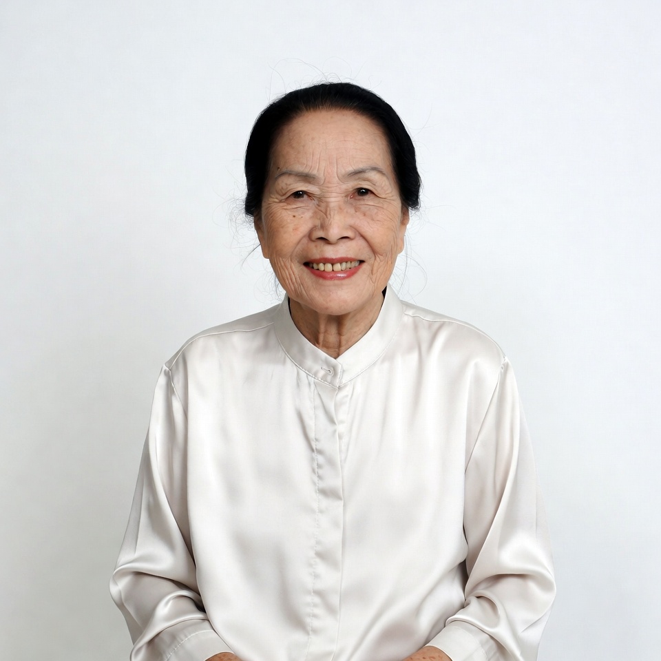 An elderly Asian woman with black hair tied back smiles warmly at the camera. She wears a white silk collared blouse with long sleeves. She stands against a plain white background.