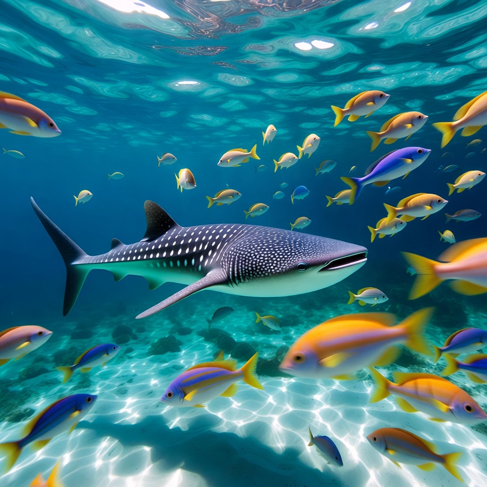 aquatic, blue fish, blue water, colorful fish, coral reef, fish school, fish swarm, gentle giant, marine animals, ocean, ocean wildlife, orange fish, reef shark, sea creatures, sea life, shark, spotted shark, striped shark, sunlight rays, swimming, tropical fish, turquoise water, underwater, yellow fish, whale shark