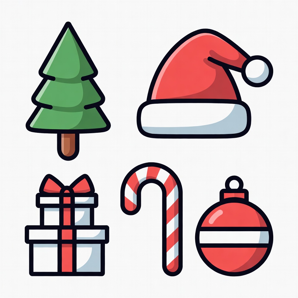 A flat vector illustration features four Christmas icons on a white background. There is a green Christmas tree with a brown trunk, a red Santa hat with white trim, a red and white candy cane, a wrapped gift box with a bow, and a red ornament ball. All elements are outlined in black with vibrant colors.