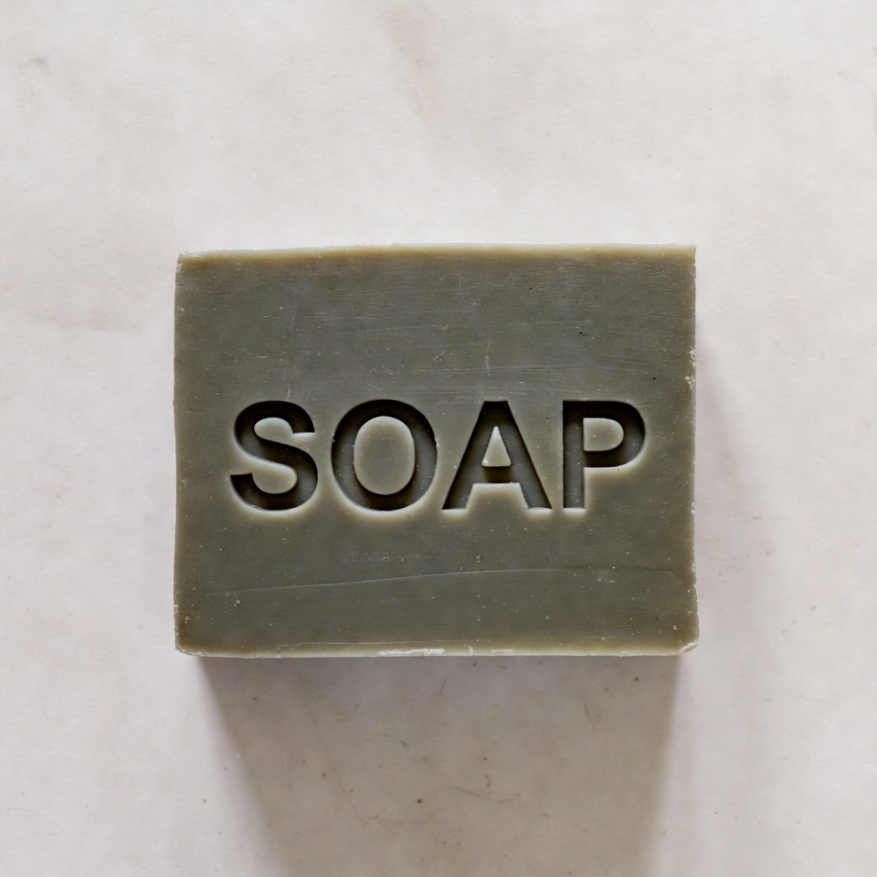 A rectangular bar of gray soap with 'SOAP' embossed in large letters sits on a white marble-like surface. The soap has a smooth, matte finish and is viewed from above. The background is plain and light-colored.