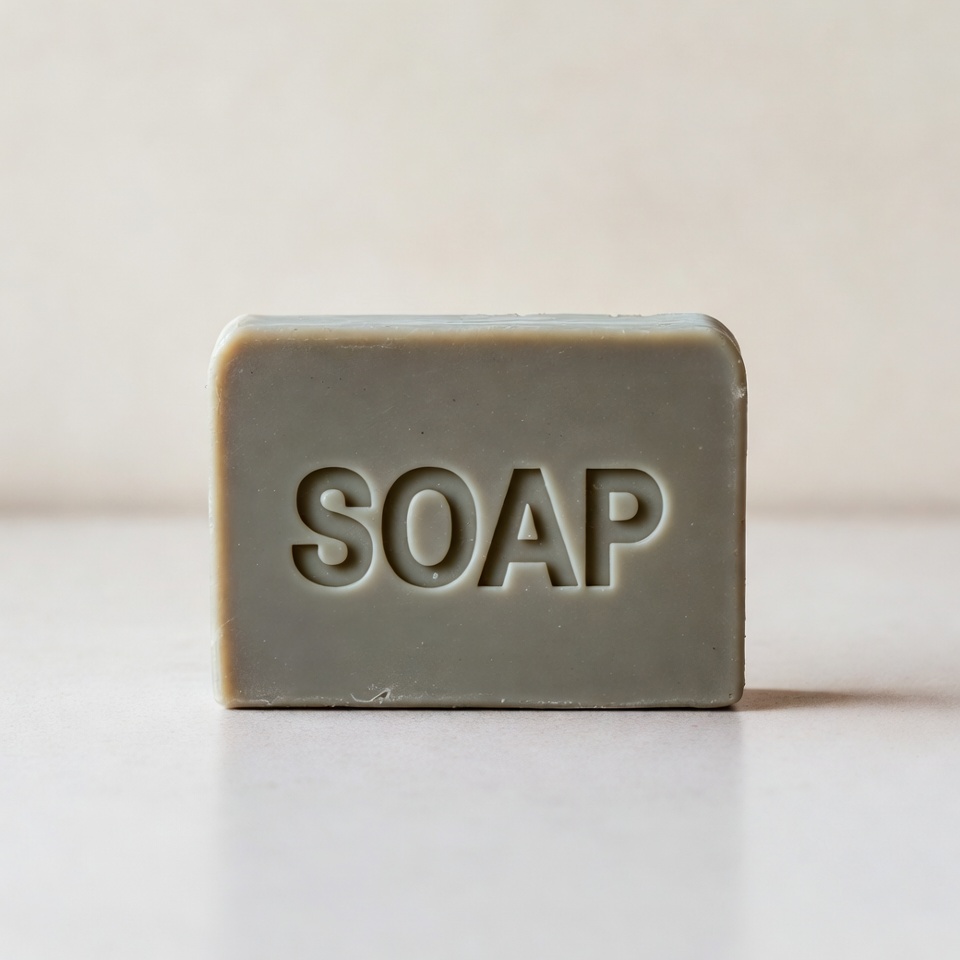 A rectangular bar of gray soap with the word 'SOAP' embossed on the front sits on a light beige surface. The soap has a smooth texture and subtle sheen. It is photographed from a front angle against a plain background.