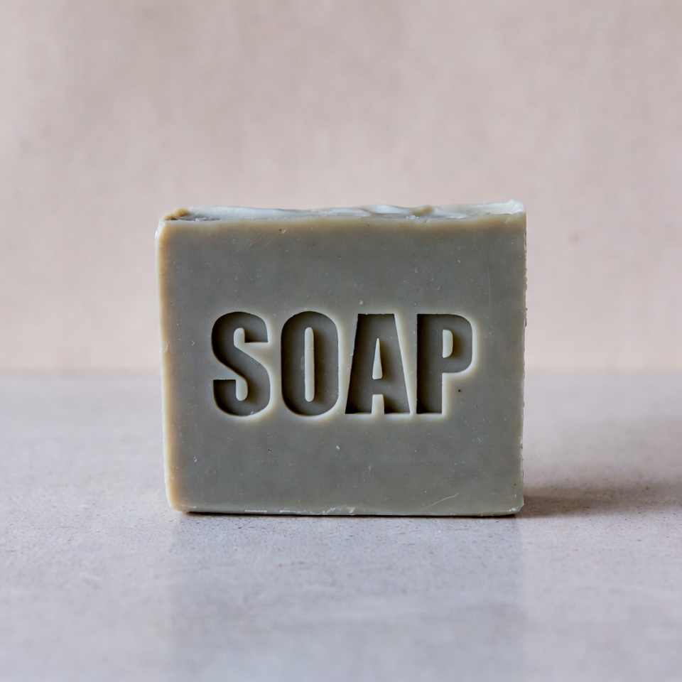 A rectangular gray soap bar sits on a light beige surface. The word 'SOAP' is embossed in large capital letters on the front and top of the bar. The soap has a smooth, matte texture and is isolated against the plain background.