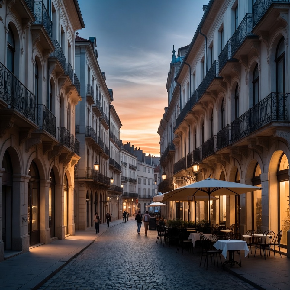 A narrow cobblestone street lined with ornate white European buildings and wrought-iron balconies glows in sunset light. Outdoor cafe tables with umbrellas and chairs sit along the sidewalks under warm street lamps. A few distant pedestrians walk the illuminated pathway.