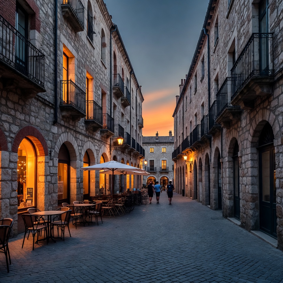 Europe, alleyway, arches, architecture, balconies, cafe, cobblestone, dusk, evening, golden hour, historic, lanterns, medieval, old town, outdoor tables, pedestrians, stone buildings, street scene, sunset, twilight, urban landscape, village street, walking people, warm lights, white umbrella, narrow street
