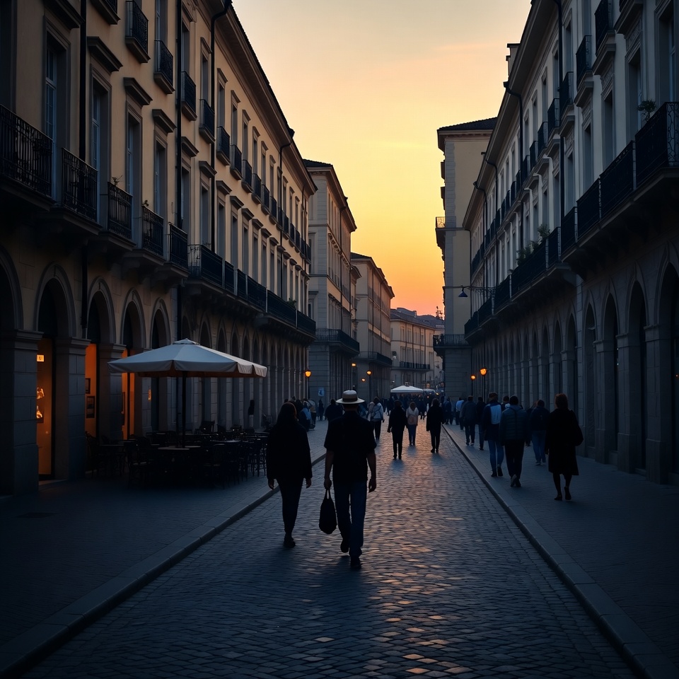 Europe, architecture, bag, city street, coats, cobblestone, evening, golden hour, hat, historic buildings, man, narrow alley, outdoor tables, pedestrians, shadows, street, umbrellas, urban scene, walking people, warm light, white hat, woman, sunset