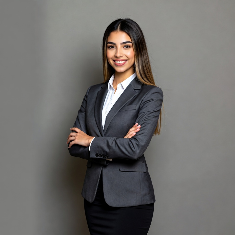 A young Latina woman with long dark hair smiles confidently while standing with arms crossed against a plain gray background. She wears a tailored gray blazer over a white collared shirt and a matching pencil skirt. Her professional attire and poised stance convey a business-like appearance.