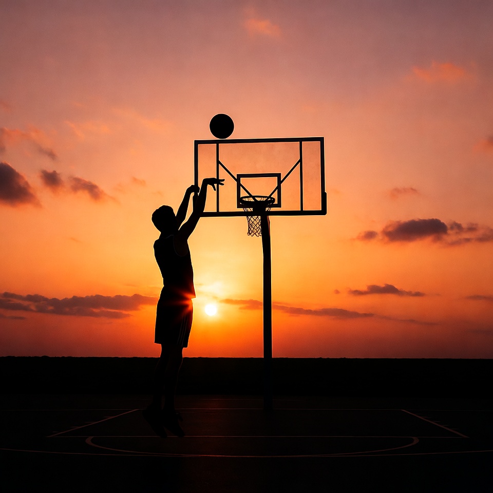 A silhouette of a man in shorts reaches up to dunk a basketball into the hoop on an outdoor court. The vibrant sunset sky with orange and pink hues illuminates the scene from behind. Clouds and the basketball hoop are sharply outlined against the glowing horizon.