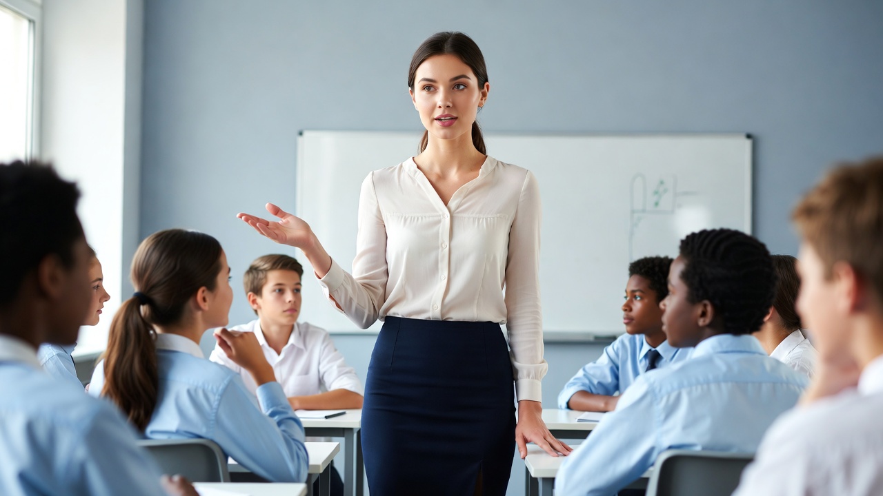 Teacher lecturing diverse students in classroom