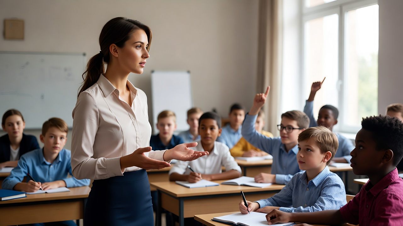 A female teacher with brown hair stands at the front of a classroom, gesturing with both hands while addressing her students. The students, a diverse group of boys and girls seated at desks, raise their hands eagerly to participate. A whiteboard and windows are visible in the bright classroom setting.