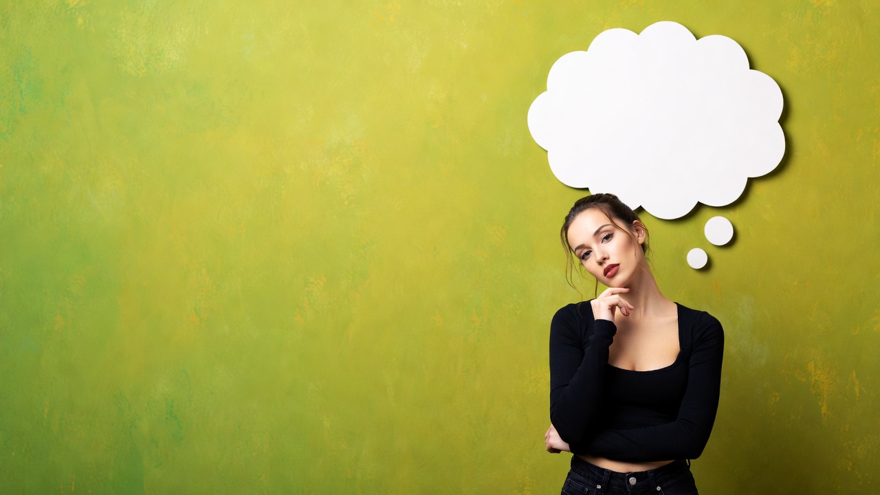 A young woman with long brown hair stands against a green background, posing with her arms crossed and finger on her chin in a thoughtful expression. She wears a black long-sleeve top and dark pants. A large white empty speech bubble and smaller bubbles hang above her head.