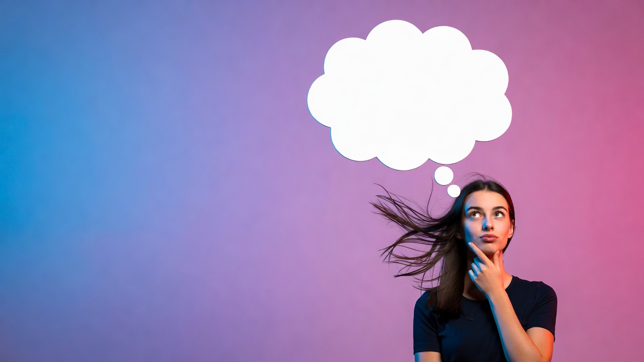 A young woman with long brown hair stands against a vibrant purple and pink gradient background. She tilts her head with her hand on her chin in a thoughtful pose, wearing a black short-sleeved top. A large white empty speech bubble floats above her head.