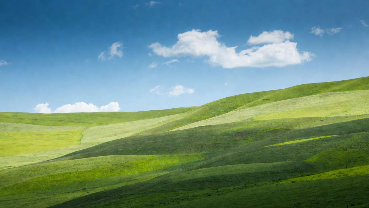 blue sky, clouds, fields, grassland, green hills, hill landscape, hills, landscape, lush grass, nature, outdoors, peaceful scenery, rural landscape, scenery, sky, summer landscape, undulating hills, vibrant green, white clouds, rolling hills