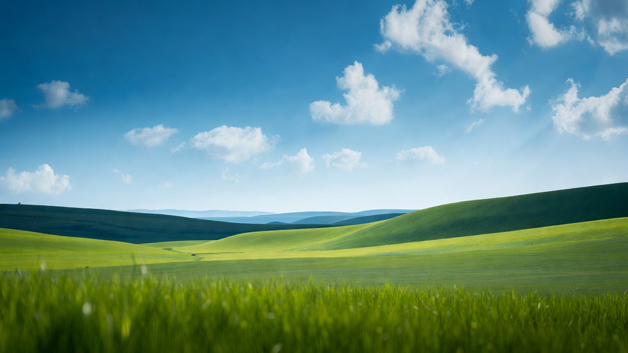 blue sky, clouds, countryside, distant hills, fields, grass, hill landscape, landscape, lush grass, meadow, natural scenery, nature, outdoors, panoramic view, rolling hills, scenery, sky, vibrant green, white clouds, green hills