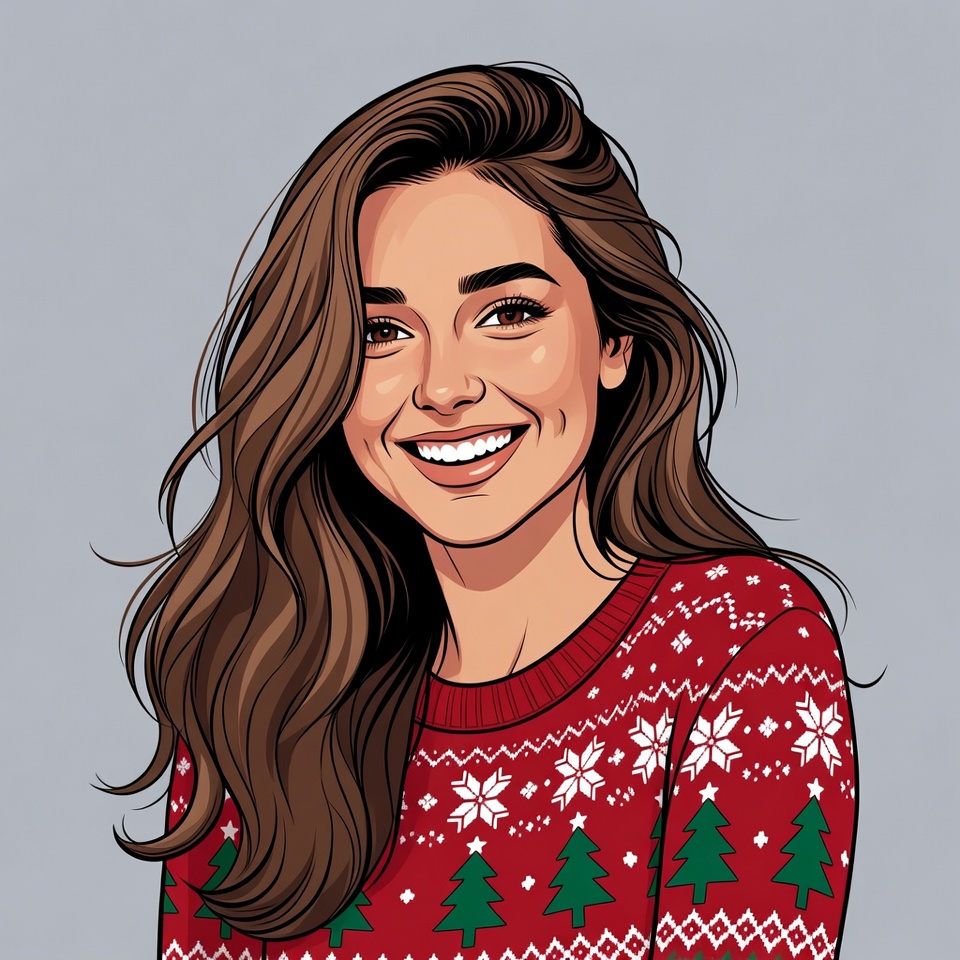 A young woman with long wavy brown hair smiles warmly at the viewer. She wears a red festive sweater adorned with white snowflakes and green Christmas trees. The illustration features her against a plain gray background.