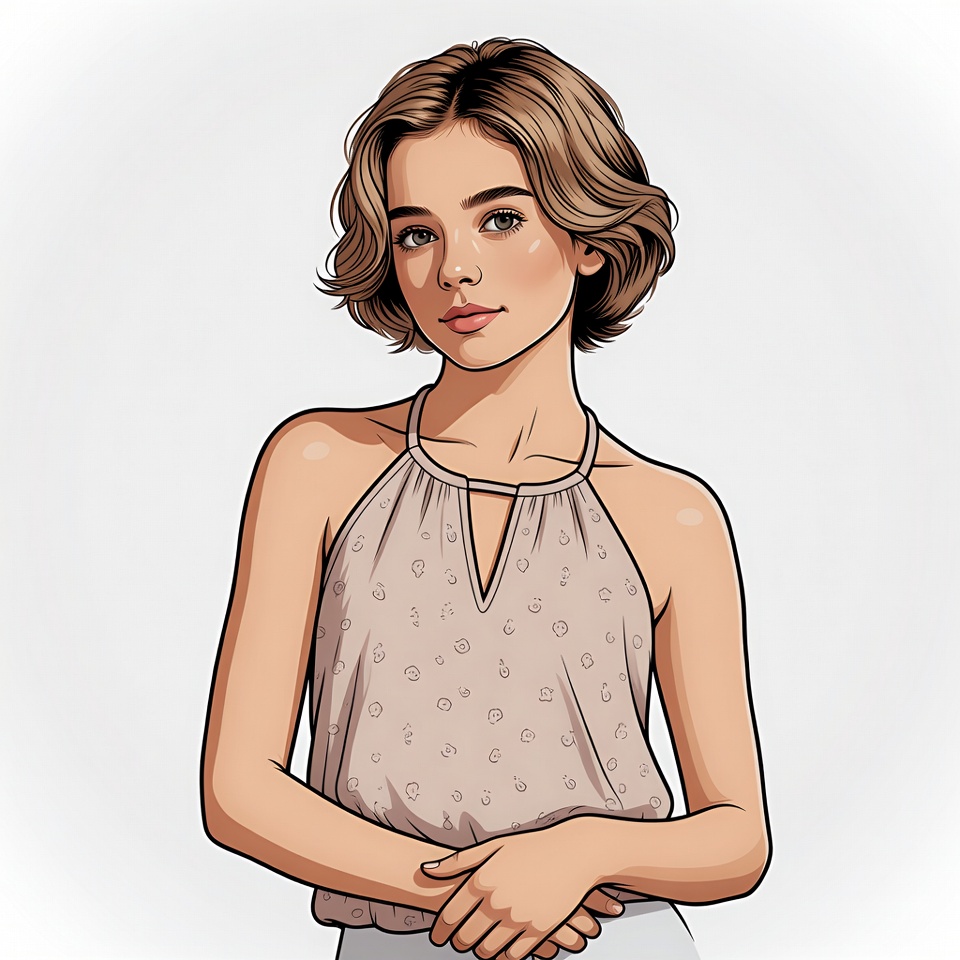 A young woman with wavy blonde hair and a subtle smile poses with hands clasped in front. She wears a light beige spaghetti strap top with small dots and white pants. The illustration features her against a plain white background.