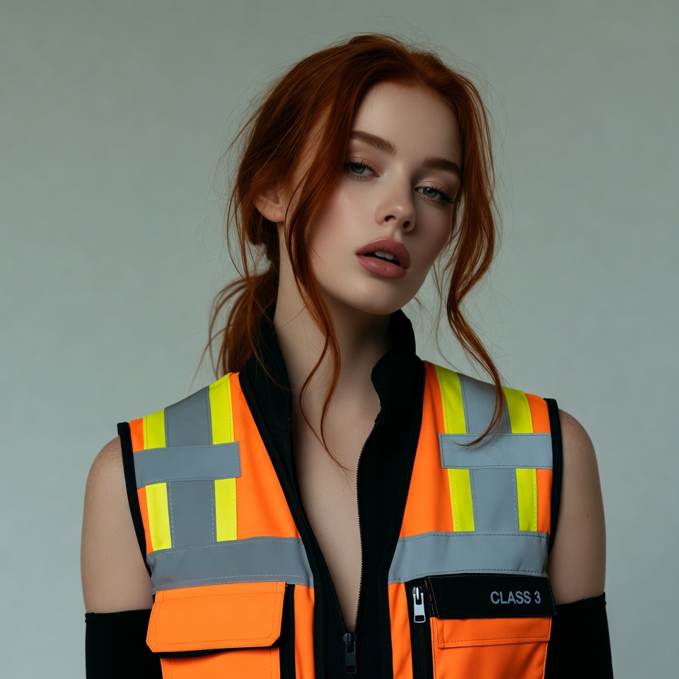 Class 3, White, black sleeves, construction vest, female, high visibility, ponytail, portrait, pout lips, red hair, redhead, reflective vest, safety gear, safety vest, studio photo, white background, workwear, yellow vest, young woman, woman