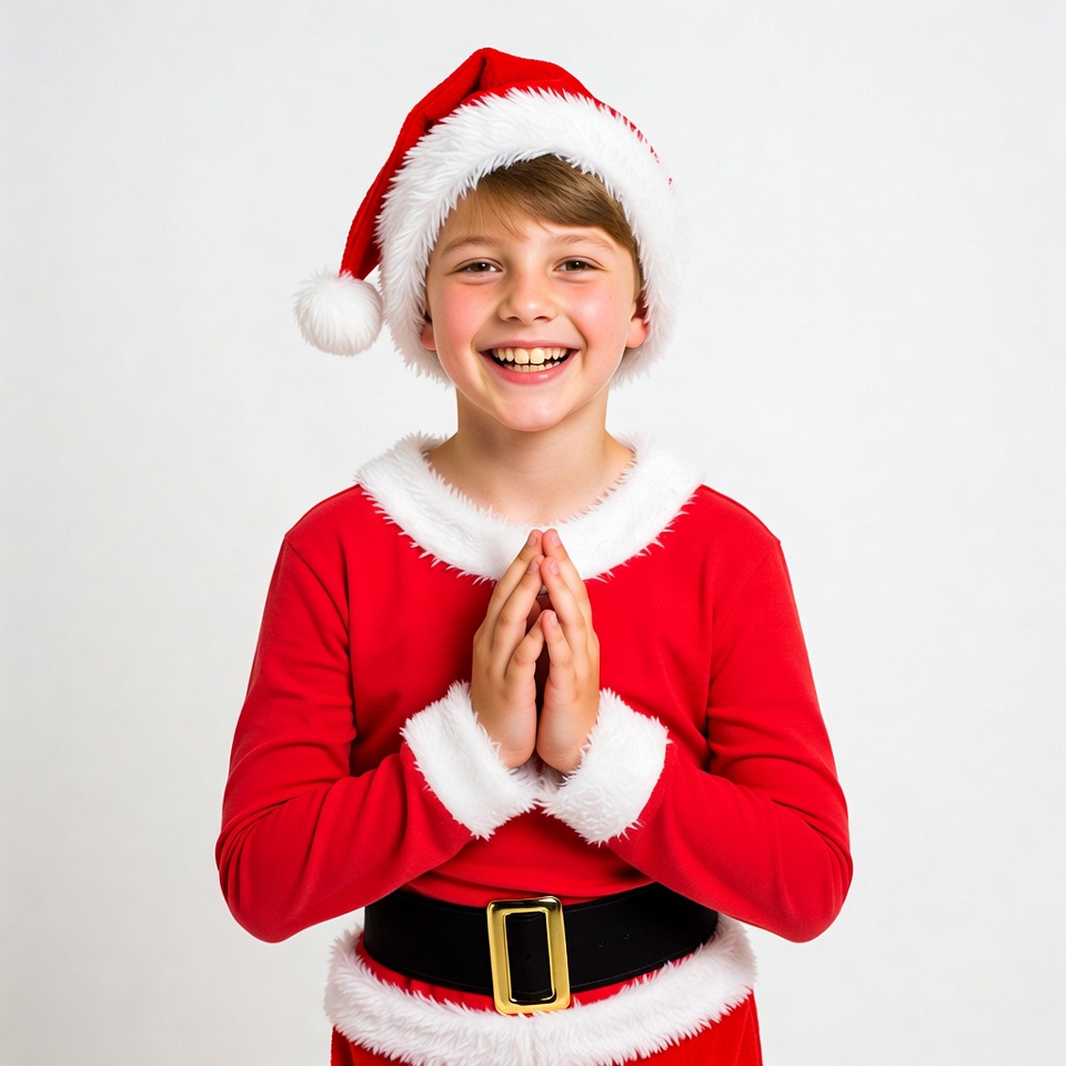 Christmas, Santa Claus boy, Santa costume, Santa hat, black belt, child, cute boy, festive attire, happy expression, holiday, isolated background, joyful child, prayer gesture, praying hands, red outfit, smiling boy, white background, white fur, young boy, boy