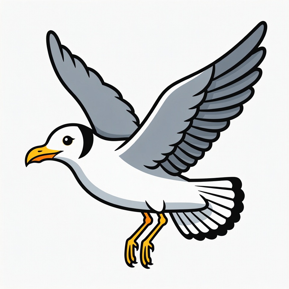 A cartoon illustration of a seagull flying with its wide gray wings outstretched. The bird features a white body, black eye mask, orange beak, and yellow legs. It is depicted on a transparent background.
