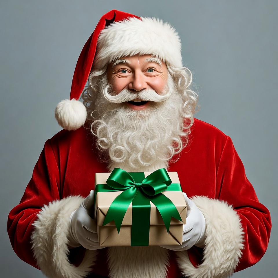 Santa Claus with a white beard and red hat smiles while holding a white gift box wrapped with a green ribbon. He wears a classic red velvet Santa suit with white fur trim and black boots. The image is set against a plain gray background.