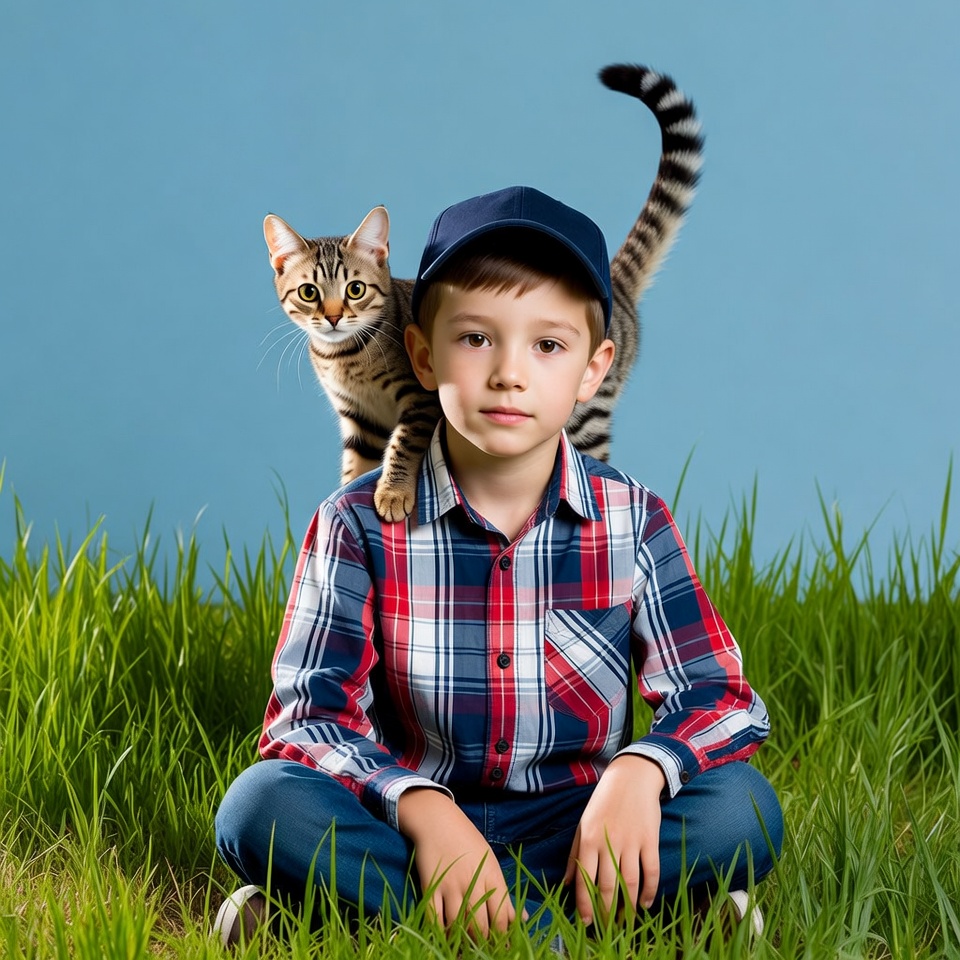 A young boy with short brown hair sits cross-legged on green grass, wearing a plaid shirt, blue pants, and a navy cap. A small tabby kitten with yellow eyes perches on his shoulders, playfully gripping his shirt. They pose against a solid blue sky with grass below.