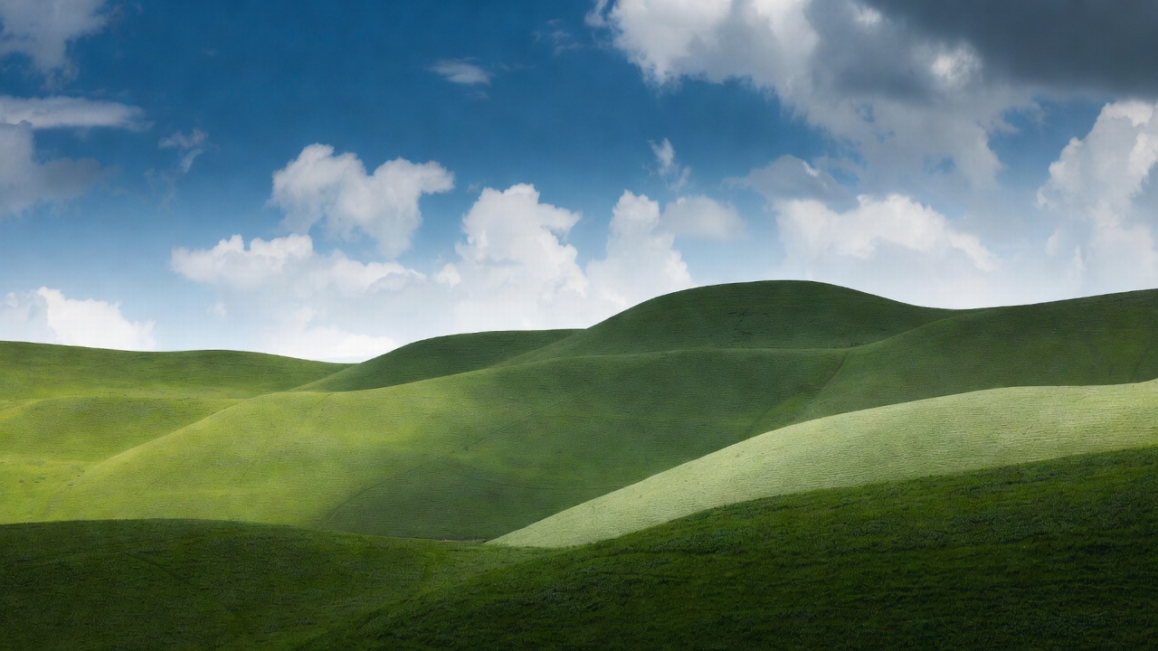 blue sky, clouds, fields, grass, grassy hills, green hills, hills, landscape, meadows, nature, outdoors, panoramic view, rural landscape, scenery, sky, smooth hills, vibrant green, white clouds, rolling hills