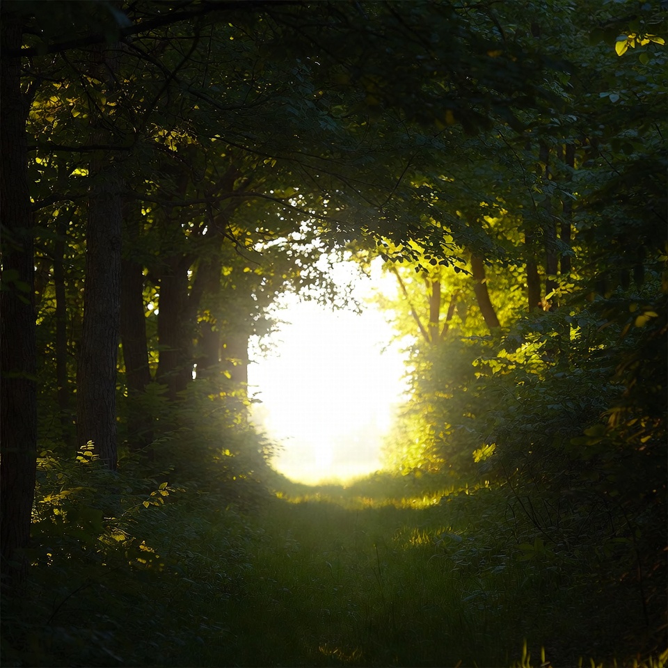 A narrow dirt path winds through dense green trees in a forest. Bright sunlight beams pierce through the canopy, creating a glowing tunnel effect ahead. Lush foliage frames the serene woodland trail.