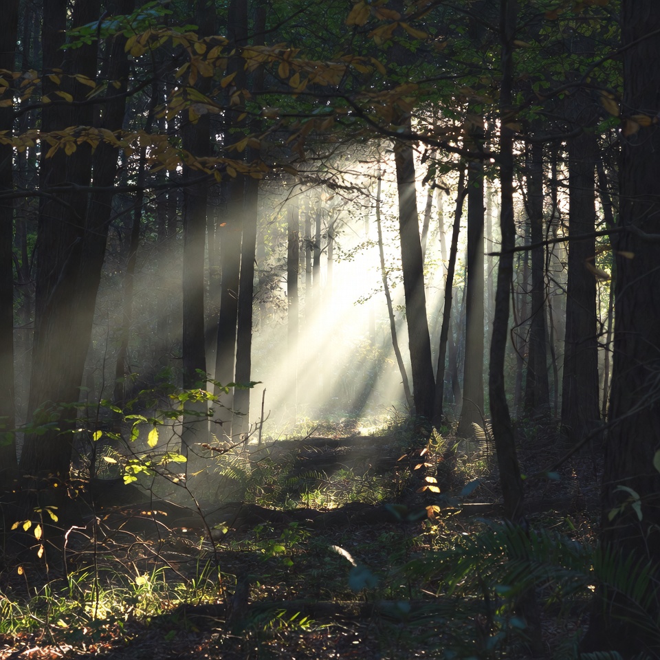 Sunbeams through autumn forest trees