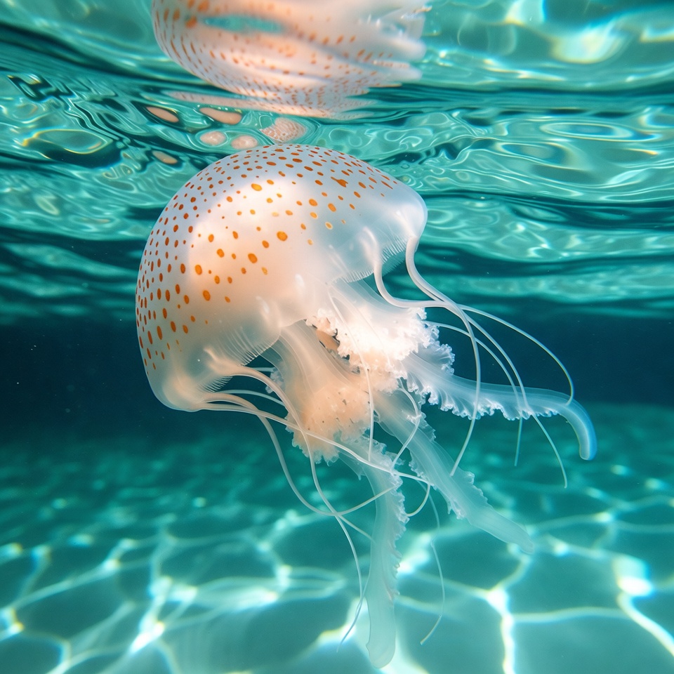 aquatic, bioluminescent, clear water, drifting, floating, jellyfish photo, jellyfish underwater, marine biology, marine life, ocean, ocean animal, orange jellyfish, orange spots, reflection, sea creature, sea jelly, spotted, spotted jellyfish, tentacles, translucent, turquoise water, underwater, underwater photography, water surface, white bell, jellyfish
