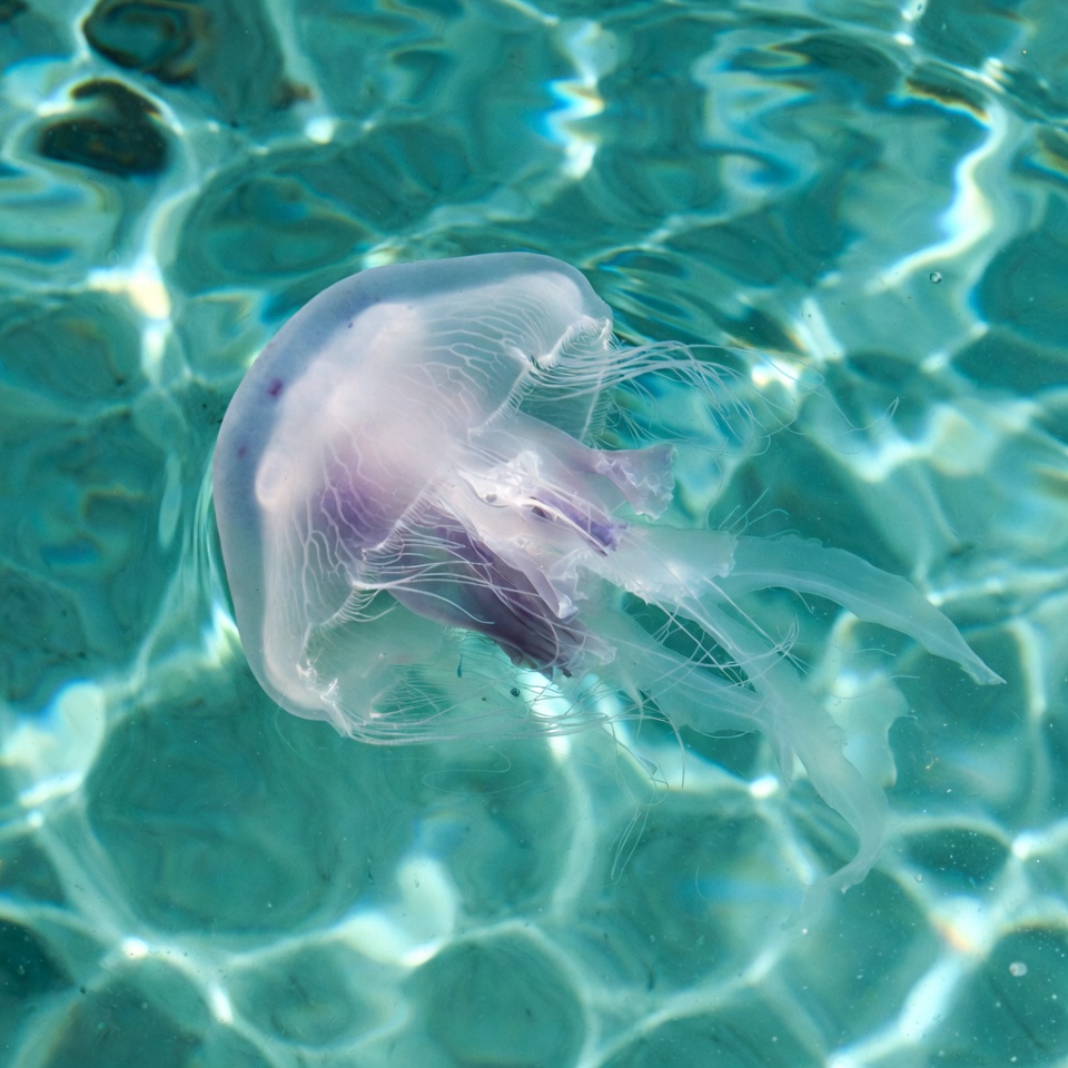 aquatic, blue water, clear water, floating jellyfish, jellyfish bell, marine life, ocean animal, purple jellyfish, rippling water, sea creature, sea jelly, sunlight water, tentacles, trailing tentacles, translucent jellyfish, turquoise water, underwater, jellyfish