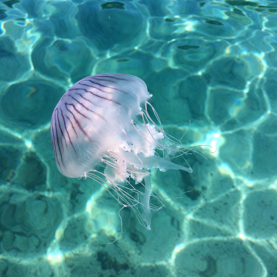 aquatic animal, blue water, clear water, floating jellyfish, jellyfish swimming, marine life, ocean, purple jellyfish, sea creature, sea jelly, striped jellyfish, tentacles, turquoise water, underwater, jellyfish