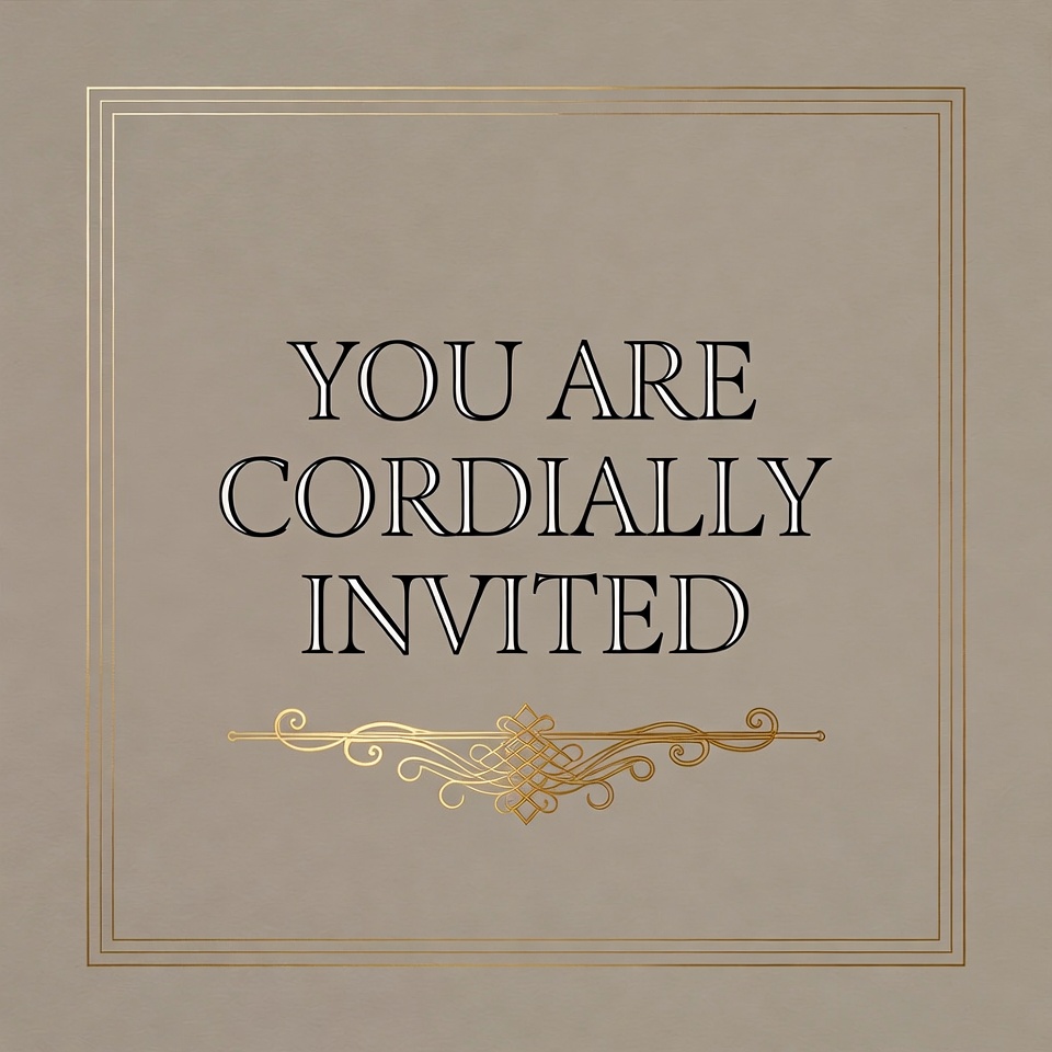 beige background, classic invitation, cordially invited, decorative border, elegant, event invitation, fancy card, formal invitation, gold flourishes, gold text, luxury invite, ornate lettering, vintage design, wedding invite, invitation