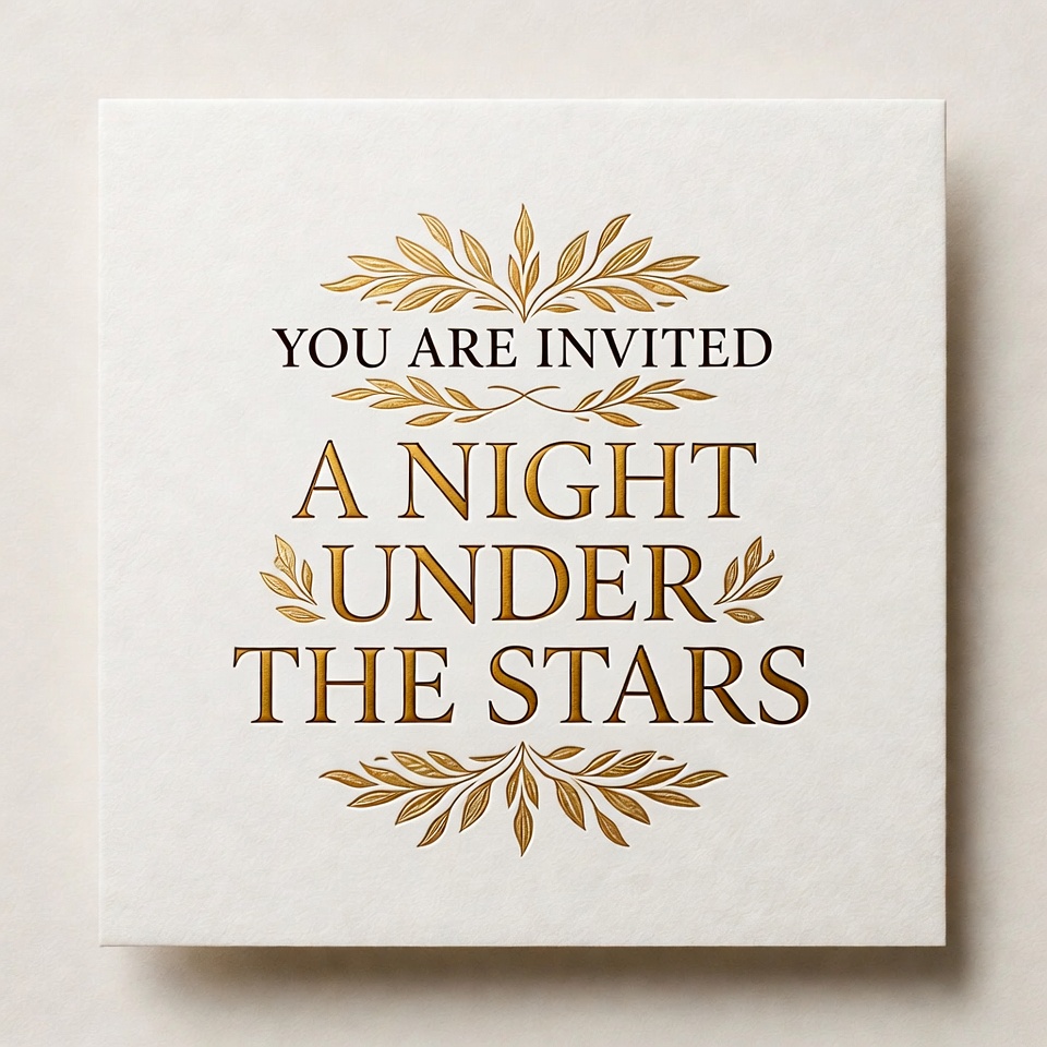 Elegant invitation card on white background features gold leaf decorations and ornate text. The central message reads 'You Are Invited A Night Under The Stars' surrounded by intricate gold laurel branches. The design has a luxurious foil-stamped appearance.