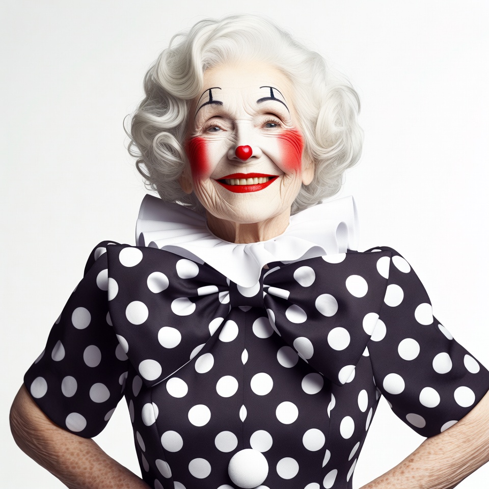 White, bow tie, circus costume, clown makeup, elderly woman, female, isolated background, joyful expression, makeup, old woman, polka dot dress, portrait, red nose, senior, smiling, wavy hair, white collar, white hair, clown