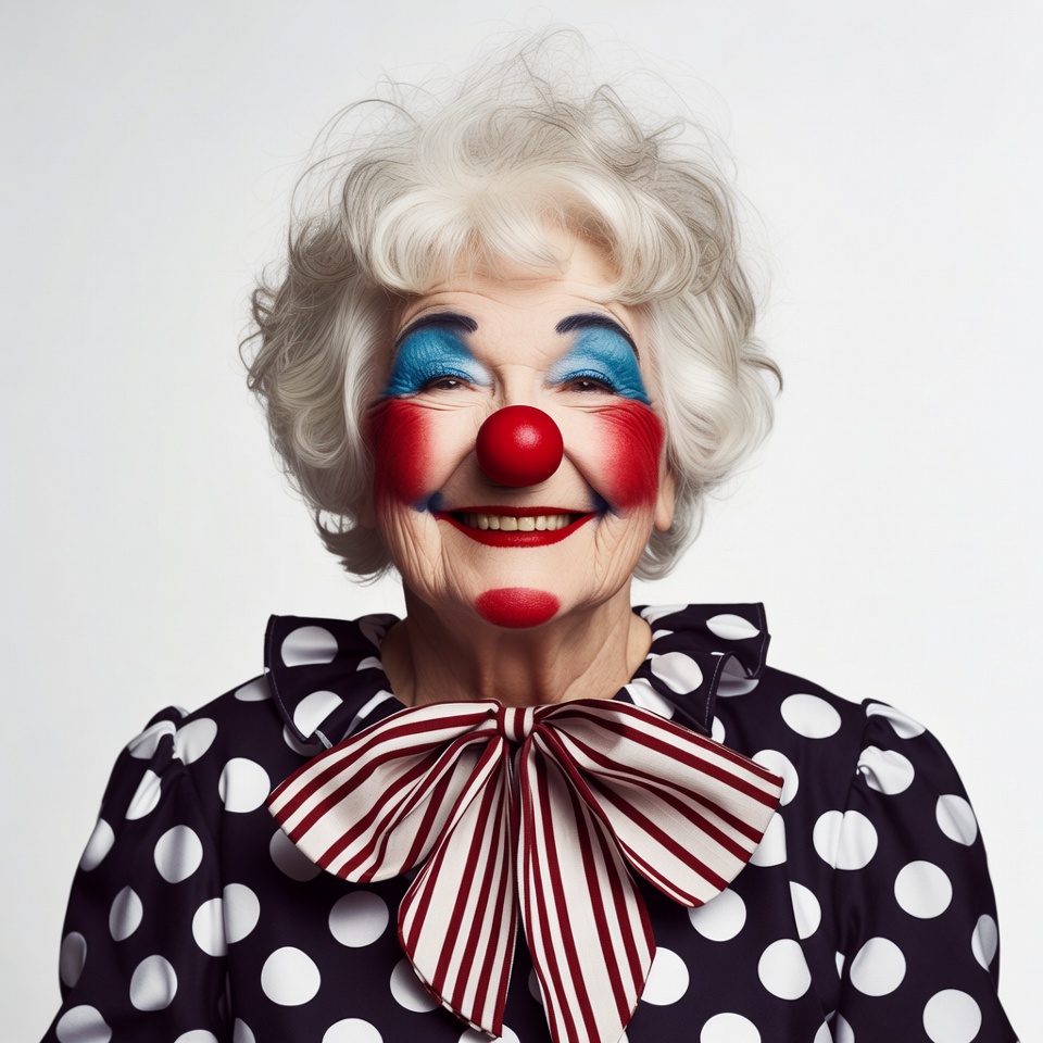 White, big smile, blue eyeshadow, bow tie, circus, clown makeup, costume, curly hair, elderly woman, female, funny, isolated background, joyful, makeup, polka dot outfit, portrait, red cheeks, red nose, senior, white hair, clown