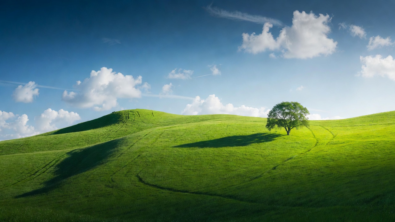 blue sky, field, grass, green grass, green hills, hill landscape, landscape, meadow, nature, outdoors, peaceful landscape, rolling hills, scenic view, single tree, sky clouds, sunny day, tree shadow, vibrant green, white clouds, lone tree