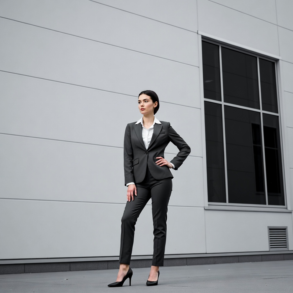 A woman with dark hair stands confidently with hands on hips in front of a modern gray building facade. She wears a tailored gray suit jacket, white blouse, matching pants, and black high heels. A large dark window is visible behind her on the concrete exterior.