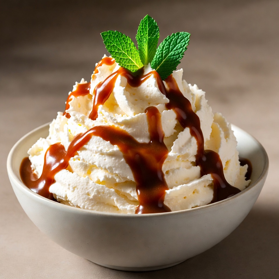 A white bowl holds a generous swirl of whipped cream topped with thick caramel sauce drizzle. Fresh mint leaves garnish the top. The dessert sits on a neutral background.