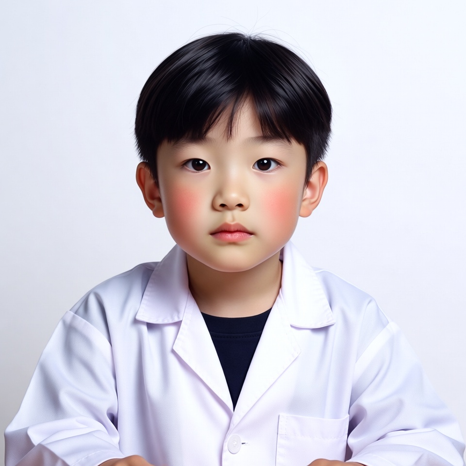 A young Asian boy with short black hair and rosy cheeks stands frontally against a white background. He wears a white lab coat over a black shirt and looks directly at the camera with a neutral expression. His hands are positioned in front of him.