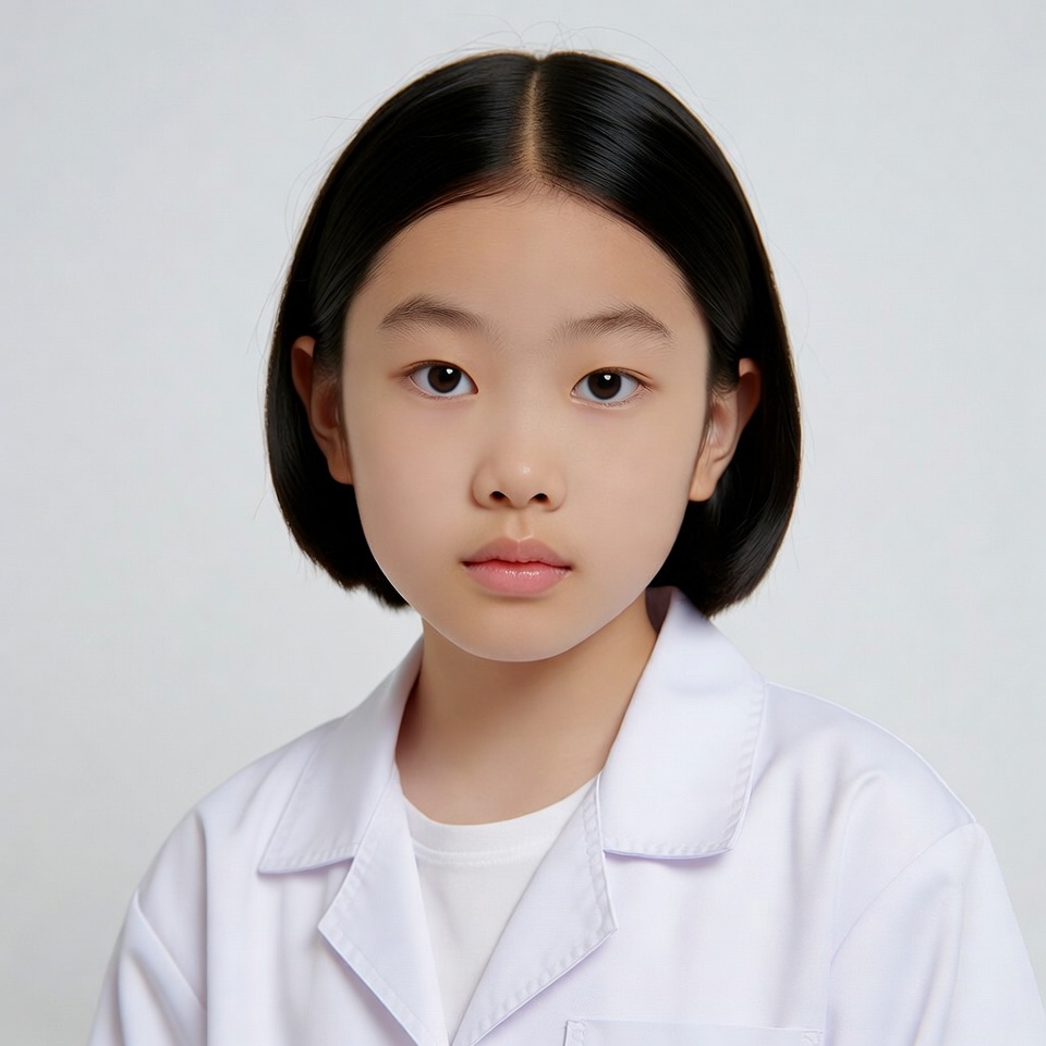A young Asian girl with straight black bob haircut stands against a plain white background. She wears a white lab coat over a white shirt and looks directly at the camera with a neutral expression. Her face features almond-shaped eyes and smooth skin.