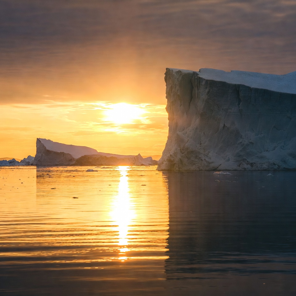 Arctic, aurora potential, calm water, clouds, cold climate, dramatic sky, expedition, frozen, glacier, golden hour, horizon, ice, icy peaks, jagged edges, landscape, nature, ocean, orange glow, polar, reflection, scenery, seascape, sunlight, sunset, water, white ice, wilderness, icebergs