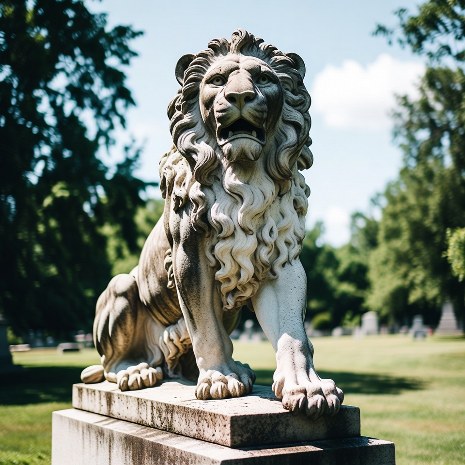 animal statue, blue sky, cemetery, detailed mane, front view, garden statue, grass, gravestones, historic monument, lion head, lion sculpture, marble lion, mausoleum lion, memorial lion, outdoor statue, park sculpture, pedestal, roaring lion, sculpture art, sitting lion, stone lion, sunny day, trees, weathered stone, white stone, lion statue