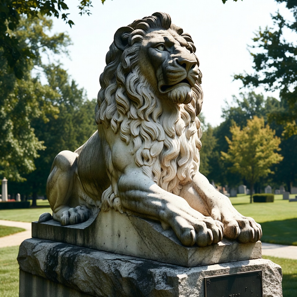 cemetery, detailed mane, fierce lion, garden statue, grass, gravestones, historical monument, lion sculpture, marble lion, memorial, monument, outdoor statue, park, pedestal, reclining lion, sculpture, stone lion, trees, white stone, lion statue