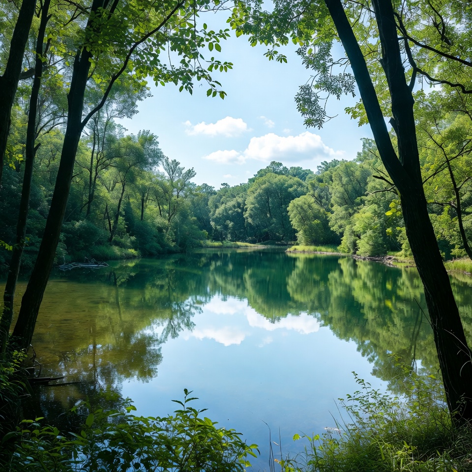 A calm lake with clear green water reflects the surrounding dense forest and blue sky with clouds. Tall trees frame the scene from the foreground, creating a natural archway. The water mirrors the lush green foliage and scattered clouds perfectly.